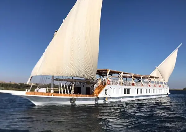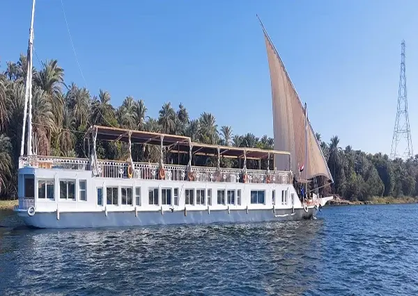 Step back in time on the Sacred Lotus Dahabiya. This beautiful boat mixes old-world charm with modern comfort. It has two masts and sails along the Nile River. You’ll enjoy the peaceful river life and see Egypt’s ancient wonders.