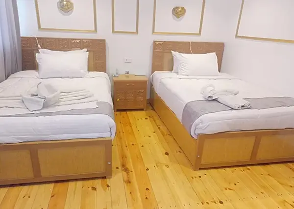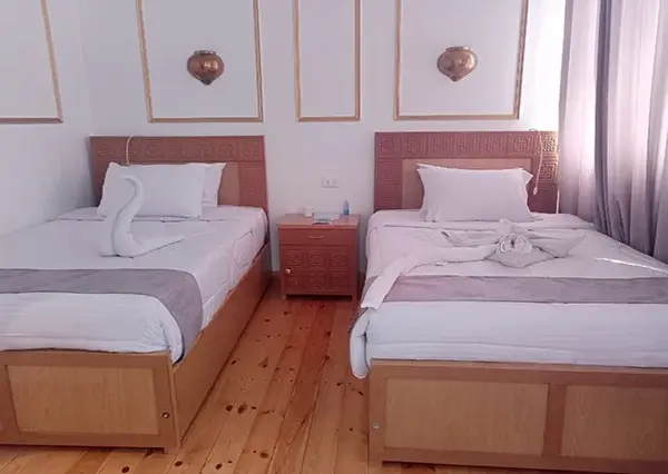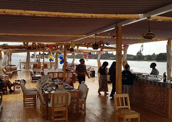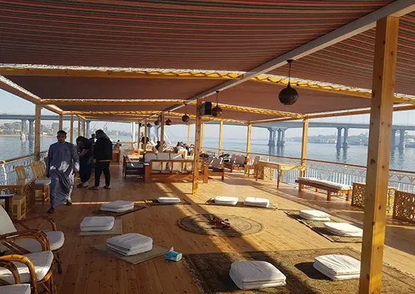 The Sacred Lotus Dahabiya boasts 8 double cabins and two suites, all air-conditioned and featuring en-suite bathrooms, ensuring a comfortable and luxurious stay. Each cabin is thoughtfully decorated with local antiques and equipped with large windows for breathtaking views of the Nile. The boat’s amenities include a gym, a steam and sauna room at no extra charge, a massage room, complimentary Wi-Fi access, and modern safety equipment.