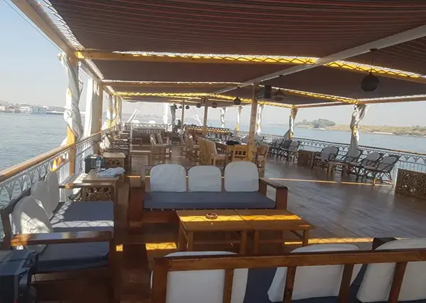 The boat’s sundeck is the perfect place to relax. You can enjoy the view of green landscapes and traditional boats. Inside, the cozy living area is great for resting. There’s a salon with a small library about Egypt and the Nile. The four cabins and one suite are perfect for a comfortable stay after your daily adventures.